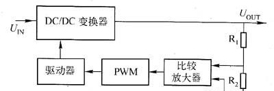 其中DC/DC變換器用以進行功率轉(zhuǎn)換,它是電源適配器的核心部分,此外還有啟動、過流與過壓保護、噪聲濾波等電路?輸出采樣電路(R1?R2)檢測輸出電壓變化,并與基準電壓U,比較誤差電壓經(jīng)過放大及脈寬調(diào)制(PWM)電路,再經(jīng)過驅(qū)動電路控制功率器件的占空比,從而達到調(diào)整輸出電壓大小的目的。