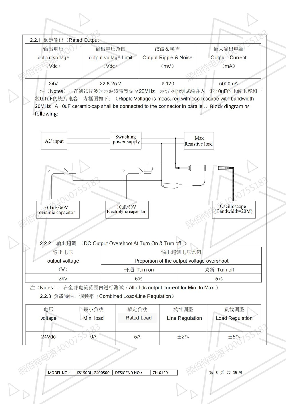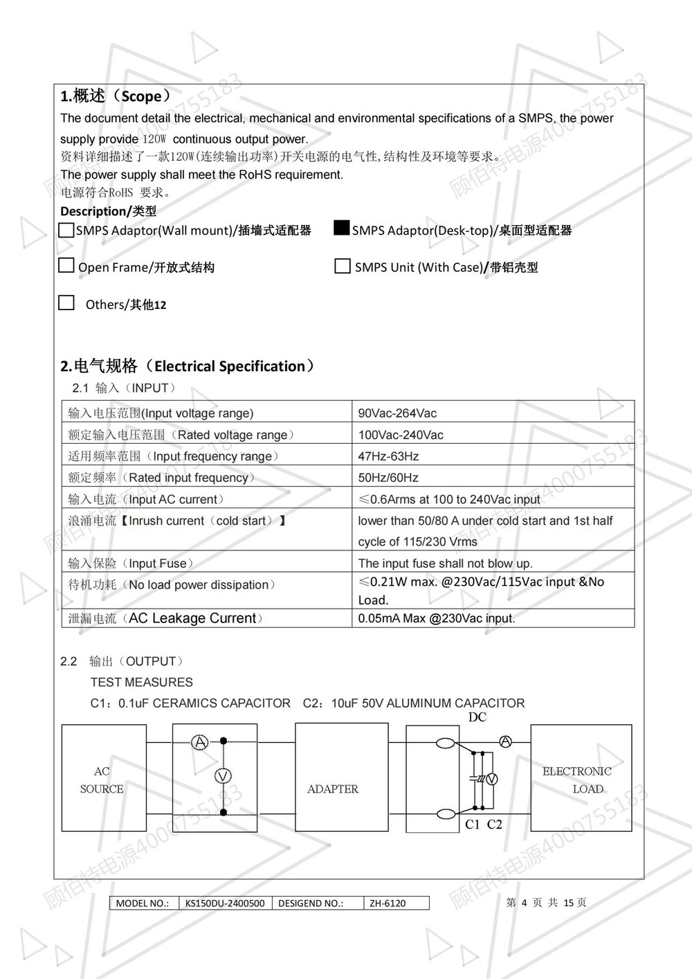 24V5A電源適配器規(guī)格書資料詳細(xì)描述了一款120W(連續(xù)輸出功率)開關(guān)電源的電氣性,結(jié)構(gòu)性及環(huán)境等要求。